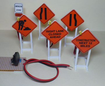 * A toggle switch (not included) may be added to the circuit as noted by the diagram for convenient on/off operation of the signs. Place the red wire from the battery holder to one terminal of the switch. Attach all red wires from the signs to the other terminal of the toggle switch. Locate the switch at a convenient location on your layout.