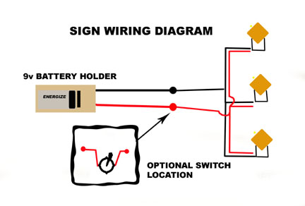 * You may add additional wire in between the battery holder and signs. Be sure that ultimately the red and black wires from the battery holder pair up with the red and black wires from the signs.