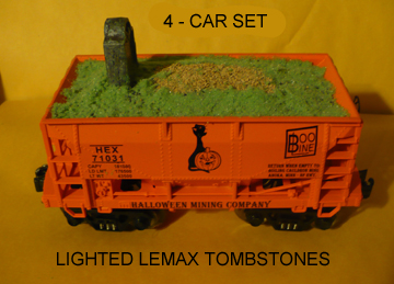 Car 3 - "GRAVE-y TRAIN": Released as a set of 4 cars with different tombstones. RMT Halloween Ore Cars each with a lighted Lemax tombstone. Operates from track power.