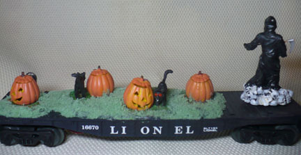 Car 2 - "SLASHING PUMPKINS": Lionel flat car with Lighted Lemax Jack O'lanterns and a rotating Lemax reaper
