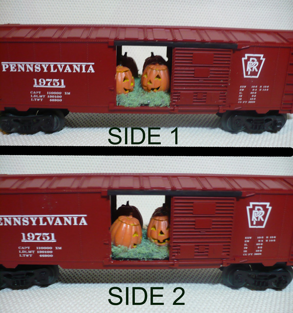 Car 1 - "JACK IN THE BOX-CAR": Lionel PRR Boxcar w/ Lemax Lighted Jack O' Lanterns