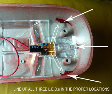 3. Now it's time to place the new LED circuit board into the locomotive shell. Carefully align the three LEDs into proper position. You want each LED to be near the lenses; it doesn't have to be perfect. You can slightly move each LED with just a bit of force but don't overdo it. Once you like the position, remove the green paper backing from the foam adhesive and press into place. Try not to touch the adhesive, it will reduce the sticking ability. Press into place and hold for about 10 seconds. Some shimming may be necessary for proper fit.