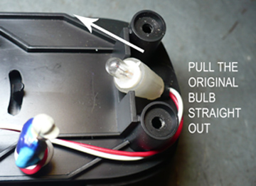 2. Remove the original bulb from the locomotive. Simply pull the bulb straight out by the plastic base. Do not discard the base, we will use that to simply wire the new circuit.