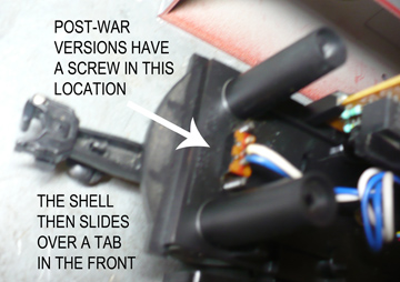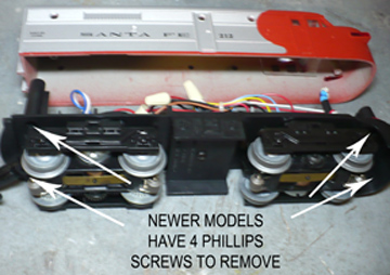 1. Start by removing the shell of your locomotive. If your locomotive is modern, there are four screws located just above the trucks as seen in picture 1A. If you have a postwar model, there will be a screw in the general area of the rear of the loco shell as seen in picture 1B. You must then slide the shell off of a tab at the front of the loco.