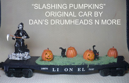 Car 2 - "SLASHING PUMPKINS": Lionel flat car with Lighted Lemax Jack O'lanterns and a rotating Lemax reaper